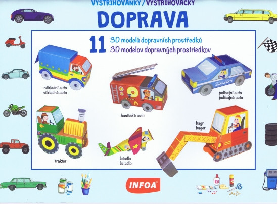 Vystrihovačky obsahujú jedenásť 3D modelov dopravných prostriedkov, ktoré si deti vystrihnú a následne zlepia. Modely: autobus, auto, vlak, lietadlo, sanitka, policajné auto, hasičské auto, džíp, bager, nákladné auto, traktor. Česko-slovenské vydanie.